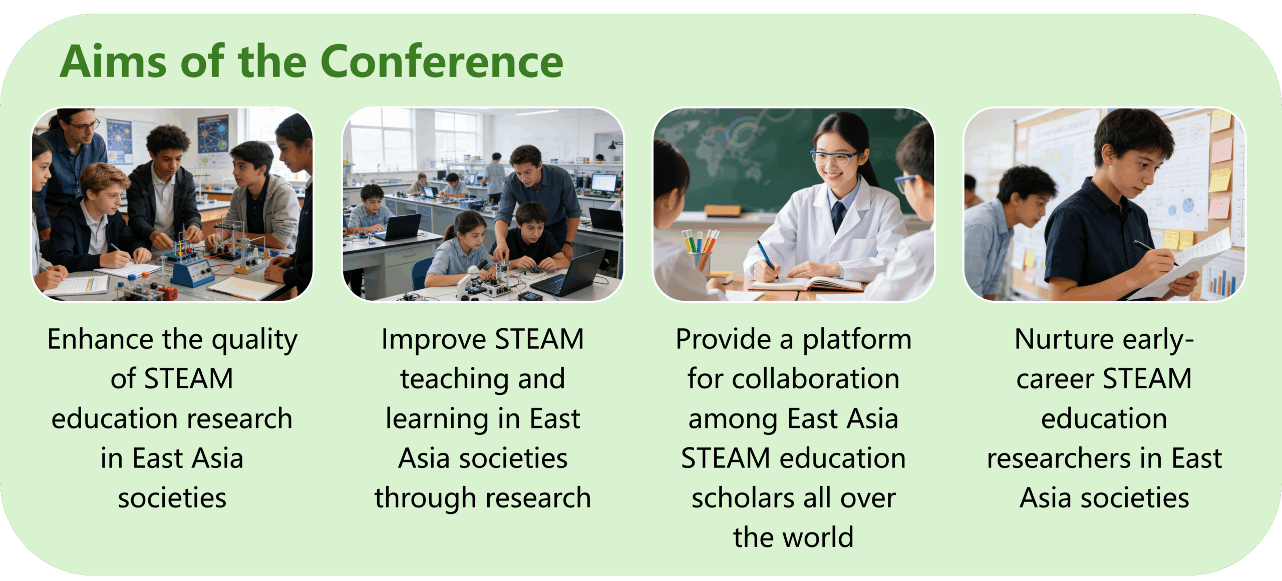 In recent years, East Asia societies have witnessed a new wave of STEAM curriculum reforms, as educators and policymakers work to address the challenges of the increasingly uncertain 21st century. As a prominent event in the field of STEAM education research for East Asia learners, this conference aims to provide a platform for East Asia STEAM education scholars from around the world to share their insights and inform the current tide of STEAM education reform. Additionally, the academic community will have the opportunity to identify novel research questions and generate new theoretical frameworks by engaging with the perspectives of frontline STEAM education practitioners.